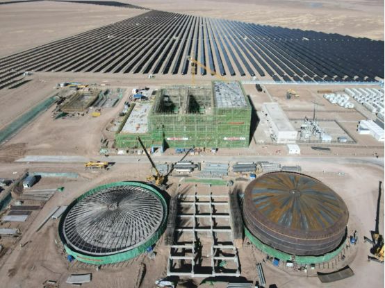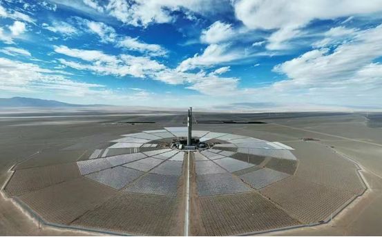 ▌项目概况:“十四五”重点能源项目,采用先进的熔盐塔式光热技术,通过1.6万面、约80万平方米的定日镜将太阳能反射至吸热塔,使熔盐升温至560℃,再通过高温熔盐进行逆流换热,实现机械能向电能的转化,输出持续稳定的清洁能源。